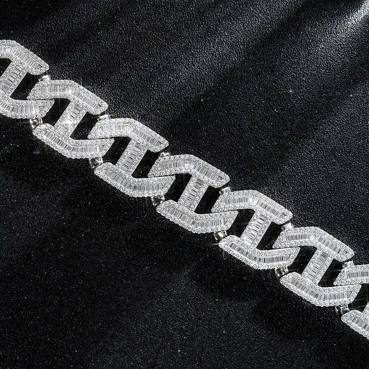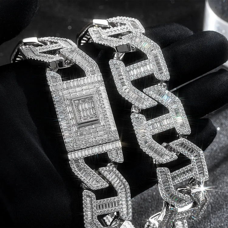 This beautifully designed, meticulously crafted 25mm chain, flawless baguette moissanite is set by hand, and the shimmer of the stone seems to "travel" on your wrist, creating a dazzling high-end decoration. Absolutely wonderful to wear on any occasion, everyone will turn their heads for you, and the light will be dazzling!